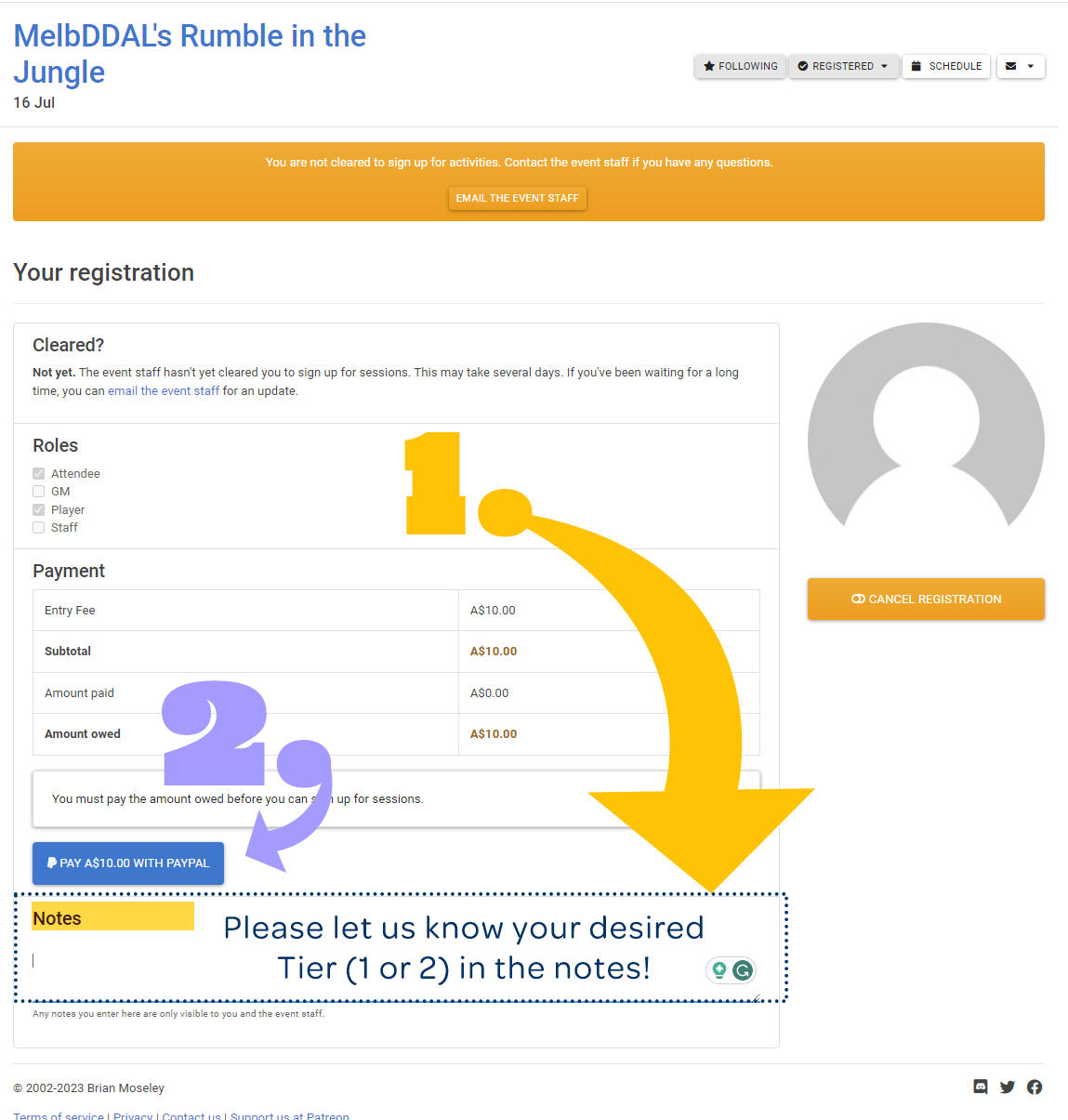 You will be directed to another page where you will have the option to leave comments. In the comment box, please include what tier you want to sign up for and where you might be contacted about your registration. If you connect your registration to Discord on that specific field, that is enough.This Epic is only for Tier 1 and 2, and there are limited tables available. Please note whether you are ok to be moved to another tier if your preferred tier is full. If you only put one tier and the tables are full, you will be waitlisted while we see if the tables can be further rearranged.[STEP THREE] Pay the entrance fee.